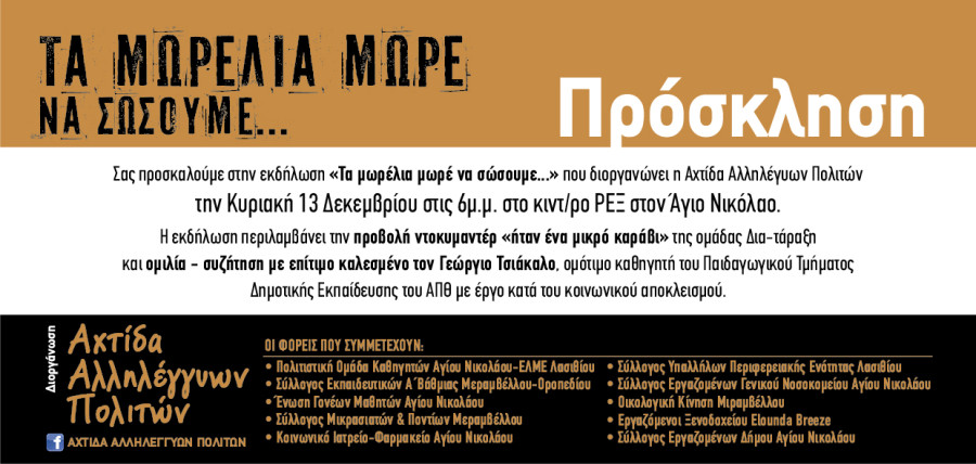 οι φορείς που συγκροτούμε την «Αχτίδα Αλληλέγγυων Πολιτών», σας προσκαλούμε να παραβρεθείτε στην εκδήλωση «Τα μωρέλια μωρέ να σώσουμε!» που οργανώνουμε την Κυριακή 13 Δεκεμβρίου στις 6μ.μ. στο κινηματοθέατρο ΡΕΞ. Περιλαμβάνει προβολή του ντοκιμαντέρ «Ήταν ένα μικρό καράβι» δημιουργία της ομάδας ΔΙΑ-τάραξη για τα κέντρα κράτησης μεταναστών και την επιχείρηση «Ξένιος Δίας», ενημέρωση για την ασφαλή διέλευση των προσφύγων από τον ομότιμο καθηγητή του Παιδαγωγικού Τμήματος Δημοτικής Εκπαίδευσης του ΑΠΘ Γιώργο Τσιάκαλο, γνωστό για το έργο του στον τομέα των εκπαιδευτικών μεταρρυθμίσεων και τους αγώνες του για την καταπολέμηση διάφορων μορφών ρατσισμού και κοινωνικού αποκλεισμού. Ο κ.Τσιάκαλος και η εκπρόσωπος της ομάδας ΔΙΑ-τάραξη συντοπίτισσά μας μεταπτυχιακή φοιτήτρια Ψυχολογίας κ.Ειρήνη Καμαράτου θα δεχτούν ερωτήσεις και θα συνομιλήσουν με το κοινό, ώστε να προκύψουν γόνιμα συμπεράσματα.