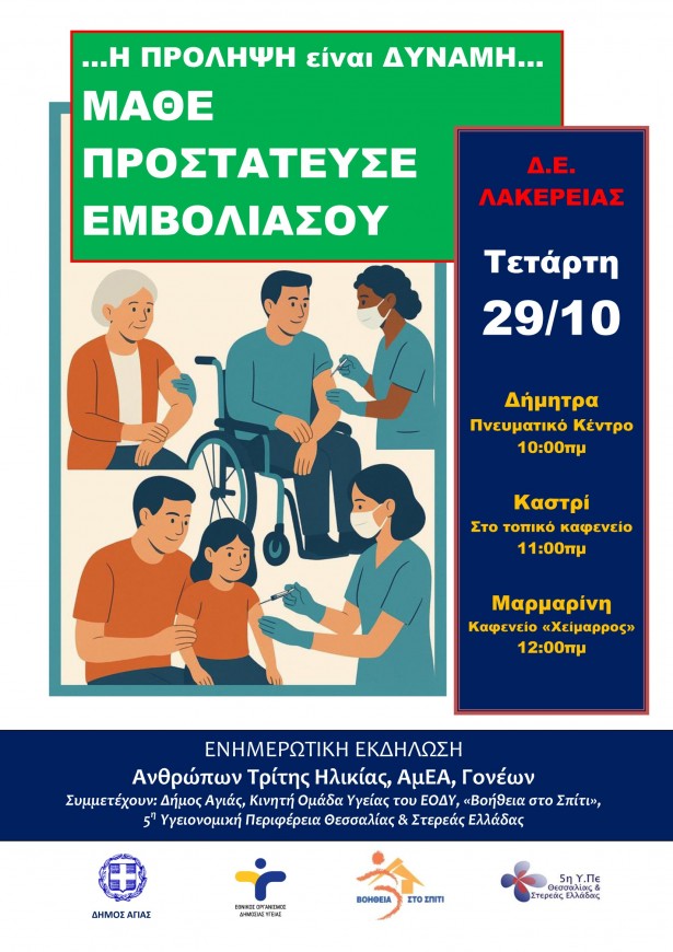 Ο Δήμος Αγιάς μέσω της Διεύθυνσης Κοινωνικής Πρόνοιας , Παιδείας, Πολιτισμού ,Αθλητισμού και Εξυπηρέτησης του Πολίτη συνεχίζει τις στοχευμένες παρεμβάσεις στον τομέα της πρόληψης και της δημόσιας υγείας, υλοποιώντας δράσεις ενημέρωσης για την αξία του εμβολιασμού σε όλες τις Δημοτικές Ενότητες του Δήμου.