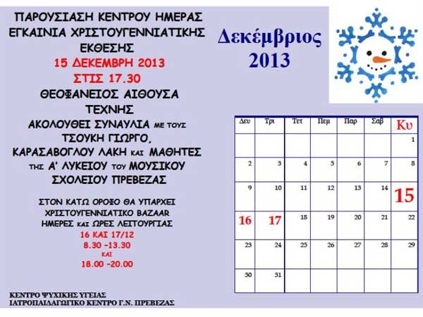 Το Κέντρο Ψυχικής Υγείας – Ιατροπαιδαγωγικό Κέντρο του Νοσοκομείου Πρέβεζας σας προσκαλεί στην εκδήλωση που θα πραγματοποιήσει την Κυριακή 15 Δεκεμβρίου 2013 και ώρα 17.30 στη Θεοφάνειο Αίθουσα Τέχνης.