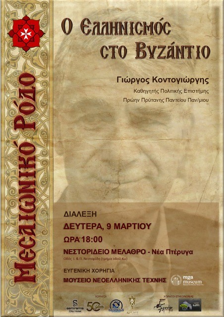 Ο σύλλογος «Μεσαιωνικό Ρόδο», με αφορμή τα 20 χρόνια συνεχούς πορείας του στα πολιτιστικά πράγματα του τόπου μας, διοργανώνει εκδήλωση με θέμα τον Ελληνισμό στο Βυζάντιο και εισηγητή τον πρώην Πρύτανη του Παντείου Παν/μίου και Πολιτικό Επιστήμονα, δρ. Γεώργιο Κοντογιώργη. Η διάλεξη θα πραγματοποιηθεί στη Νέα Πτέρυγα του Μουσείου Νεοελληνικής Τέχνης (Οδός Ι. & Π. Νεστορίδη – τμήμα οδού Κω), τη Δευτέρα, 9 Μαρτίου και ώρα 18:00, με Ελεύθερη Είσοδο για το κοινό.