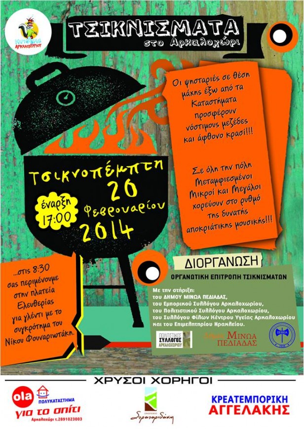 Τα «Τσικνίσματα στο Αρκαλοχώρι» συνδιοργανώνουν οι τοπικοί φορείς που απαρτίζουν την Οργανωτική Επιτροπή των Τσικνισμάτων, ο Δήμος Μινώα Πεδιάδας και ο Δ.Ο.Π.Α.Π. με τη στήριξη του Επιμελητηρίου Ηρακλείου.