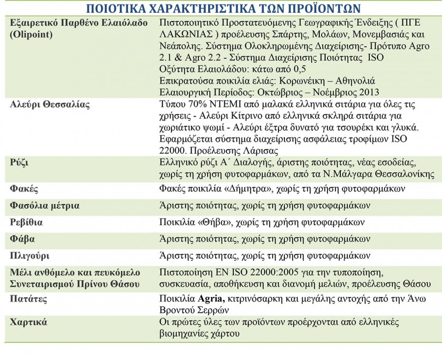 Σημείωση: Ακολουθούν αναλυτικοί πίνακες των προϊόντων και των ποιοτικών χαρακτηριστικών τους