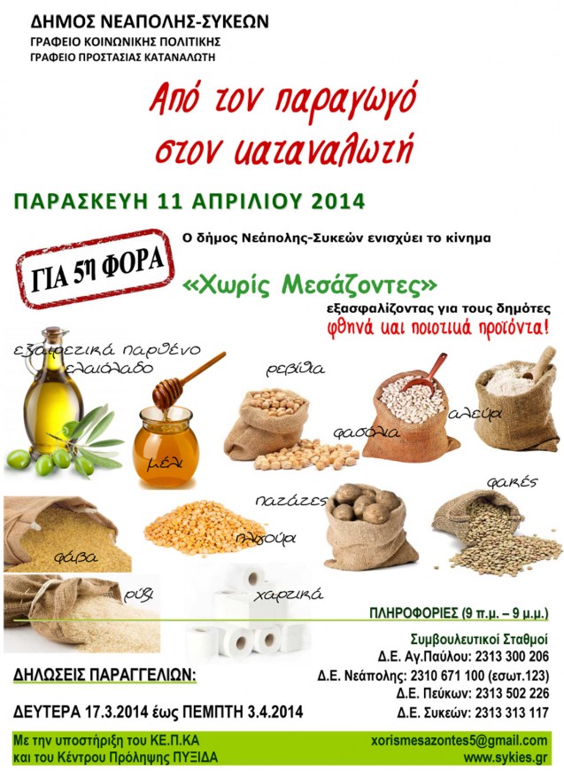 Συκεών οργανώνοντας άλλη μια εξόρμηση διάθεσης ποιοτικών και φθηνών προϊόντων πρώτης ανάγκης για τους καταναλωτές. Πρόκειται για την πέμπτη κατά σειρά τακτική εκστρατεία ενίσχυσης του κινήματος «Χωρίς Μεσάζοντες», που έχει πλέον θεσμοθετηθεί στο δήμο, στο πλαίσιο της προτεραιότητας που θέτει η δημοτική αρχή για τη στήριξη των νοικοκυριών με την απευθείας διάθεση αναγκαίων ειδών διατροφής, με σεβασμό στις ανάγκες και την αξιοπρέπεια κάθε πολίτη.