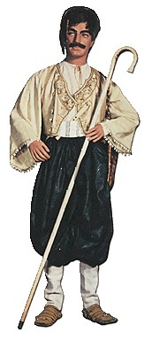 Η ανδρική, αποτελούμενη από μεταξωτό λευκό πουκάμισο, μακριά με πολλές πτυχές βράκα, μεταξωτό μακρύ ζωνάρι με ζωηρά συνήθως χρώματα, μεταξωτό σακάκι, το “μεντενέ”, κόκκινο φέσι με μακριά φούντα, πλεχτές κάλτσες και παπούτσια παντοφλέ. Το χειμώνα ο μεντενές ήταν μάλλινος, και φορούσαν από πάνω μακρύ μανδύα διακοσμημένο με γούνα. Στο ζωνάρι συνήθως φύλαγαν το “καλαμάρι” και την οικογενειακή σφραγίδα τους. Η φορεσιά αυτή σήμερα φυλάσσεται στο μουσείο και ανήκε στα μέλη της οικογένειας Φαλτάϊτς, πριν υιοθετήσουν τα Ευρωπαϊκά στα τέλη του 19ου αιώνα.