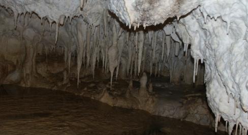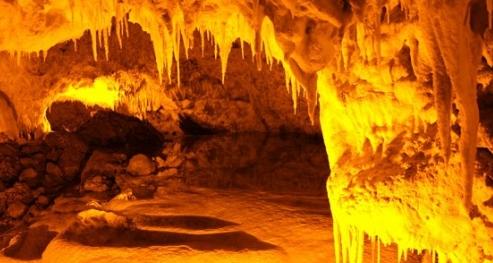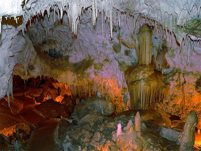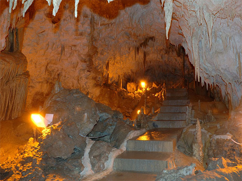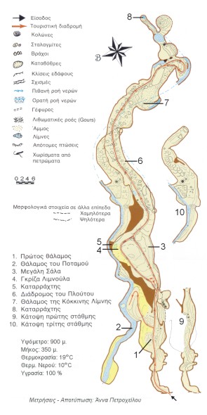 Η διαδρομή: Αμέσως μετά την είσοδο του σπηλαίου ο διάδρομος οδηγεί στον Πρώτο Θάλαμο μήκους 17 μ. διακοσμημένος με όμορφους παραπετασματοειδείς σταλακτίτες που φτάνουν ως το δάπεδο. Αριστερά διανοίγεται ο Θάλαμος του Ποταμού.
