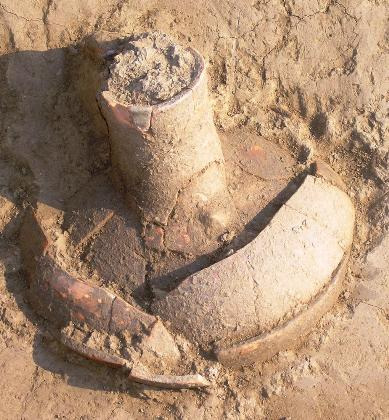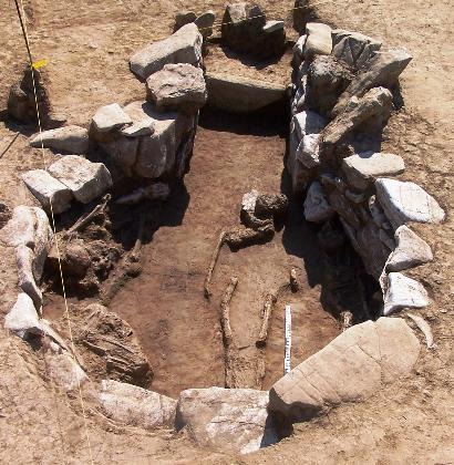 Δύο μικρού μεγέθους ασβεστολιθικές πέτρες, η μία ως είδος προσκέφαλου, οριοθετούσαν την κεντρική ταφή. Η κατάσταση διατήρησης των οστών δεν ήταν καλή. Αρκετά κοντά στο αριστερό μηριαίο οστό είχε εναποτεθεί μία οπισθότμητη πρόχους, με μαύρο γάνωμα πιθανότατα σε όλη την επιφάνεια και μαστοειδή απόφυση, ως προσφορά στο νεκρό, σύμφωνα με τα θεσσαλικά πρότυπα των Πρωτογεωμετρικών χρόνων. Στο εσωτερικό του κτιστού θολωτού τάφου δεν βρέθηκε μεγάλος αριθμός κτερισμάτων, γεγονός που μαρτυρεί την πιθανή σύληση του κατά το παρελθόν, καθώς έλειπε το μεγαλύτερο τμήμα της θόλου. Εντοπίστηκε μία λίθινη χάντρα και ένα επιχρυσωμένο, χάλκινο κόσμημα πιθανότατα για το στολισμό των μαλλιών.
